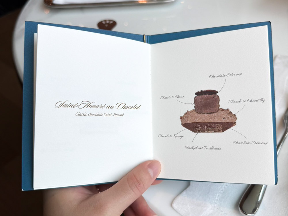On the base inside is buckwheat feuilletine with chocolate sponge and coated with chocolate cremeux. On top, there’s chocolate chantilly, chocolate choux, and more chocolate cremeux, a super chocolate combo. This delighted my partner, who is a big chocolate lover. It’s rich, deep, and properly satisfying—the kind of dessert that feels indulgent in a very classic way. If you love chocolate, this one will definitely make you happy.