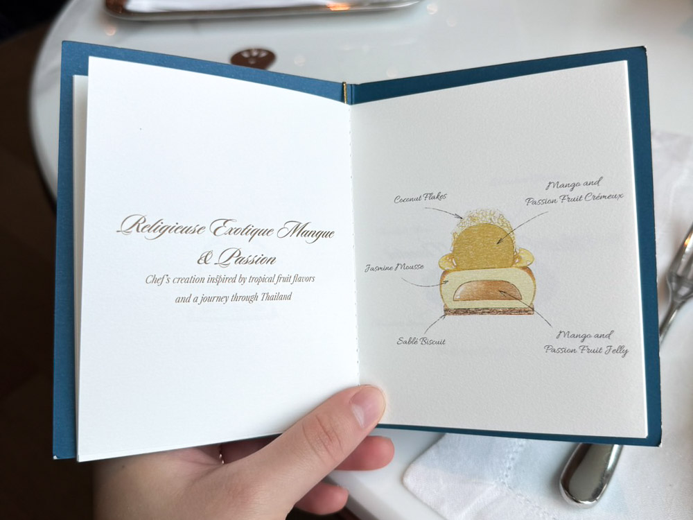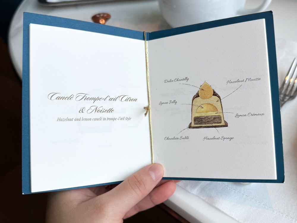 What a hard name to read. Anyway, it’s hazelnut mousse with chocolate sable, lemon jelly, lemon cremeux inside, and sponge hidden within as well. Now, this one is a bomb. The moment you start to enjoy the hazelnut, you get hit with lemon. It was very lively for me, but for my partner, it felt like quite a sudden flavor change. I personally found it quite fun.