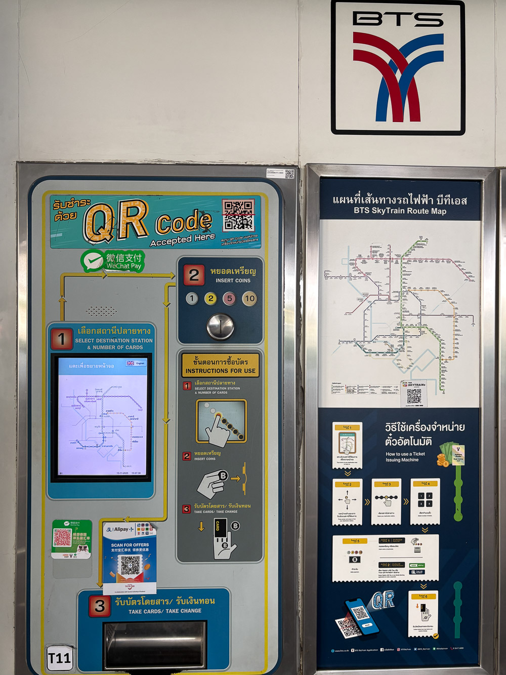 BTS and MRT are providers of train services in Bangkok, one for the sky train and one for the metro underground train, respectively. For the BTS Skytrain, consider a Rabbit card, available for purchase at the counter, if you are planning to use the service often; otherwise, buy the ticket card at the machines or kindly ask the staff at the counter for assistance. To use the card at the BTS gate, tap the card at the machine to enter and insert the card to exit.